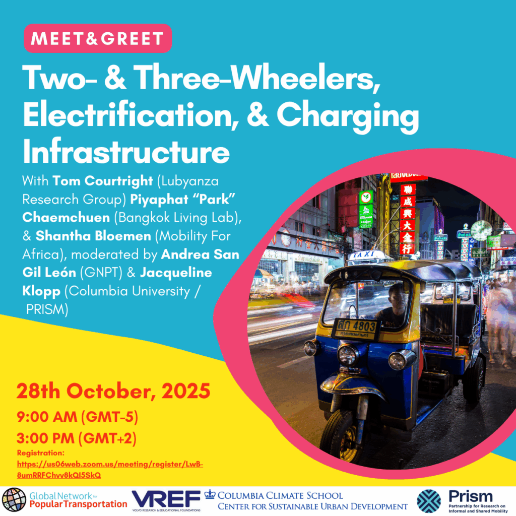 The Partnership for Research on Informal and Shared Mobility (PRISM) invites you to a Meet and Greet on Two- & Three-Wheelers, Electrification, & Charging. The meet-and-greet will be held on Zoom at 1:00 PM GMT Tuesday, October 28th.